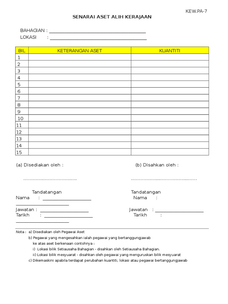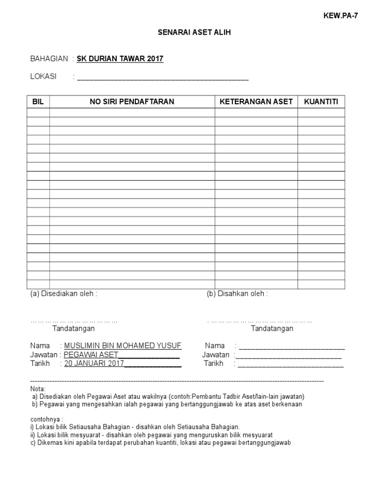 7.kew.pa 7 (senarai aset di lokasi) by sk jalan haji baki 4517 views. Pa 5 senarai daftar inventori nombor siri pendaftaran bil nama aset tarikh perolehan harga perolehan. 0 ratings0% found this document useful (0 votes). Tempoh tindakan pelupusan tindakan pelupusan mengikut kaedah yang diluluskan hendaklah. Memastikan perabot dan peralatan mencukupi.