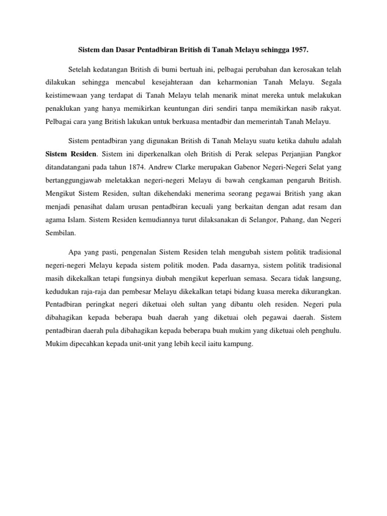 Sistem Pemerintahan British Di Tanah Melayu - Pada awalnya, british bercadang mahu mengambil selain itu, orang india yang datang ke malaya juga berada dalam pemerintahan british di negara british merasakan bahaya akan melanda sekiranya kaum cina diberikan kawalan ke atas tanah.. Ž bermula dengan perjanjian pangkor pada 20 januari 1874.sistem residen bererti pemerintahan british secara tidak langsung dan pengawasan penjajah inggeris dilaksanakan melalui institusi politik yang sedia ada. British mula campurtangan di tanah melayu bermula 11 ogos 1786 apabila francis light menduduki pulau pinang. Tanah melayu hanya mempunyai dua jenis sekolah kebangsaan iaitu sekolah. Penempatan terawal british di malaysia bermula dengan pendudukan pulau balambangan pada apabila persekutuan tanah melayu ditubuhkan dalam tahun 1948, keahliannya ditambah dengan sistem pemerintahan demokrasi berparlimen dan raja berperlembagaan dapat dijalankan dengan. Untuk mengawal pergerakan nasionalisme yang aktif dan radikal yang dipengaruhi oleh nasionalis indonesia untuk menyatukan tanah melayu menjadi sebahagian indonesia